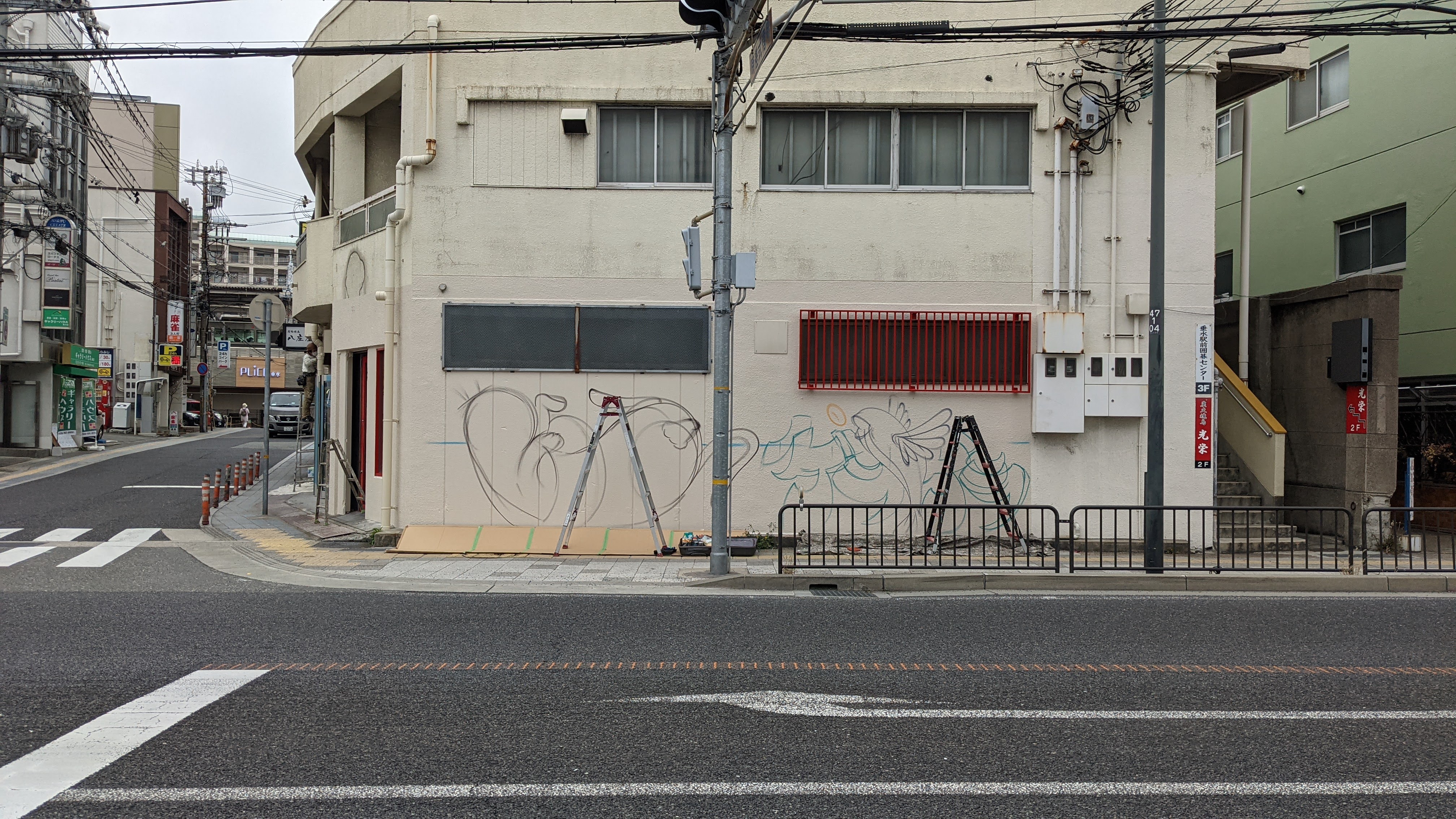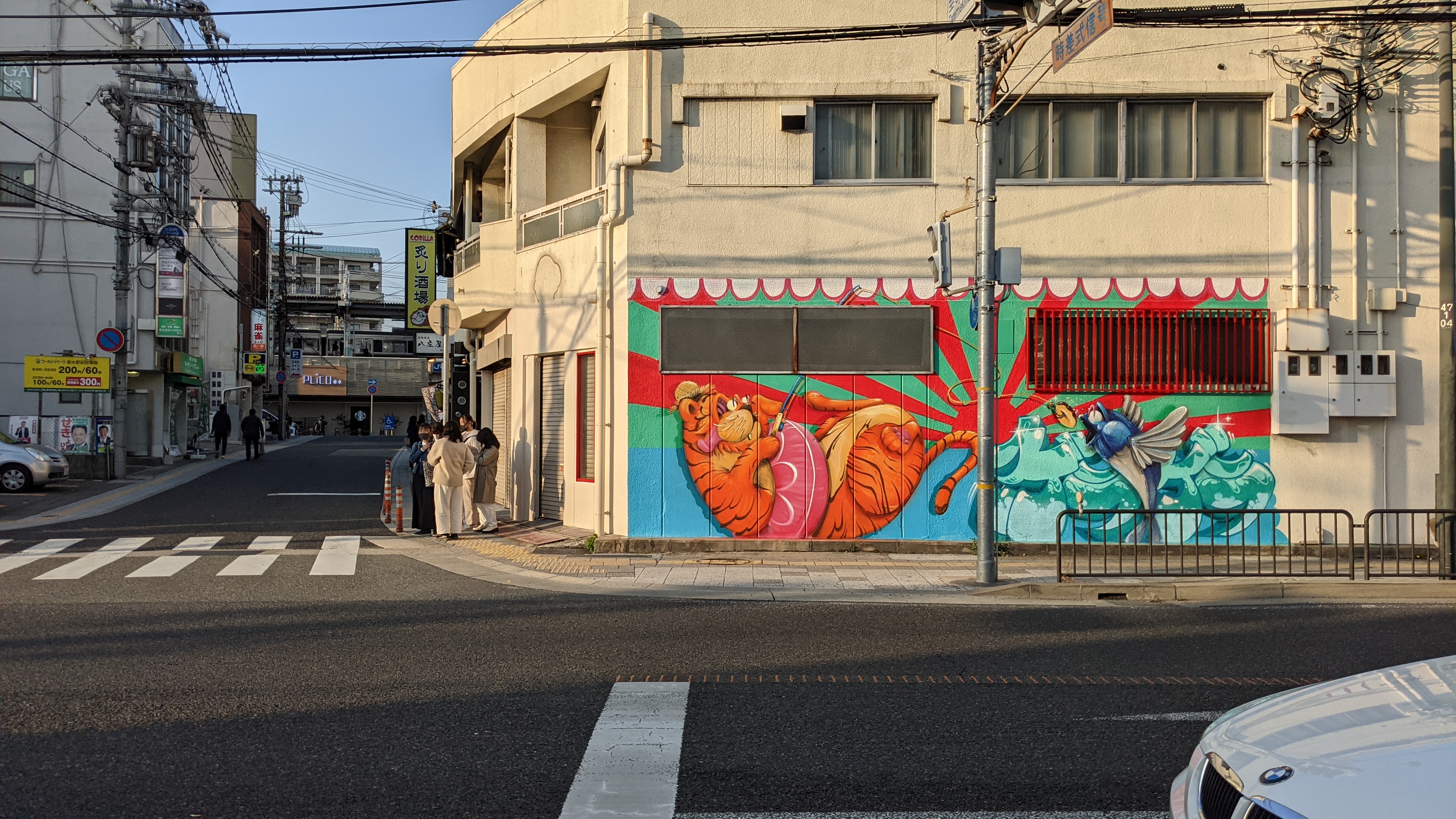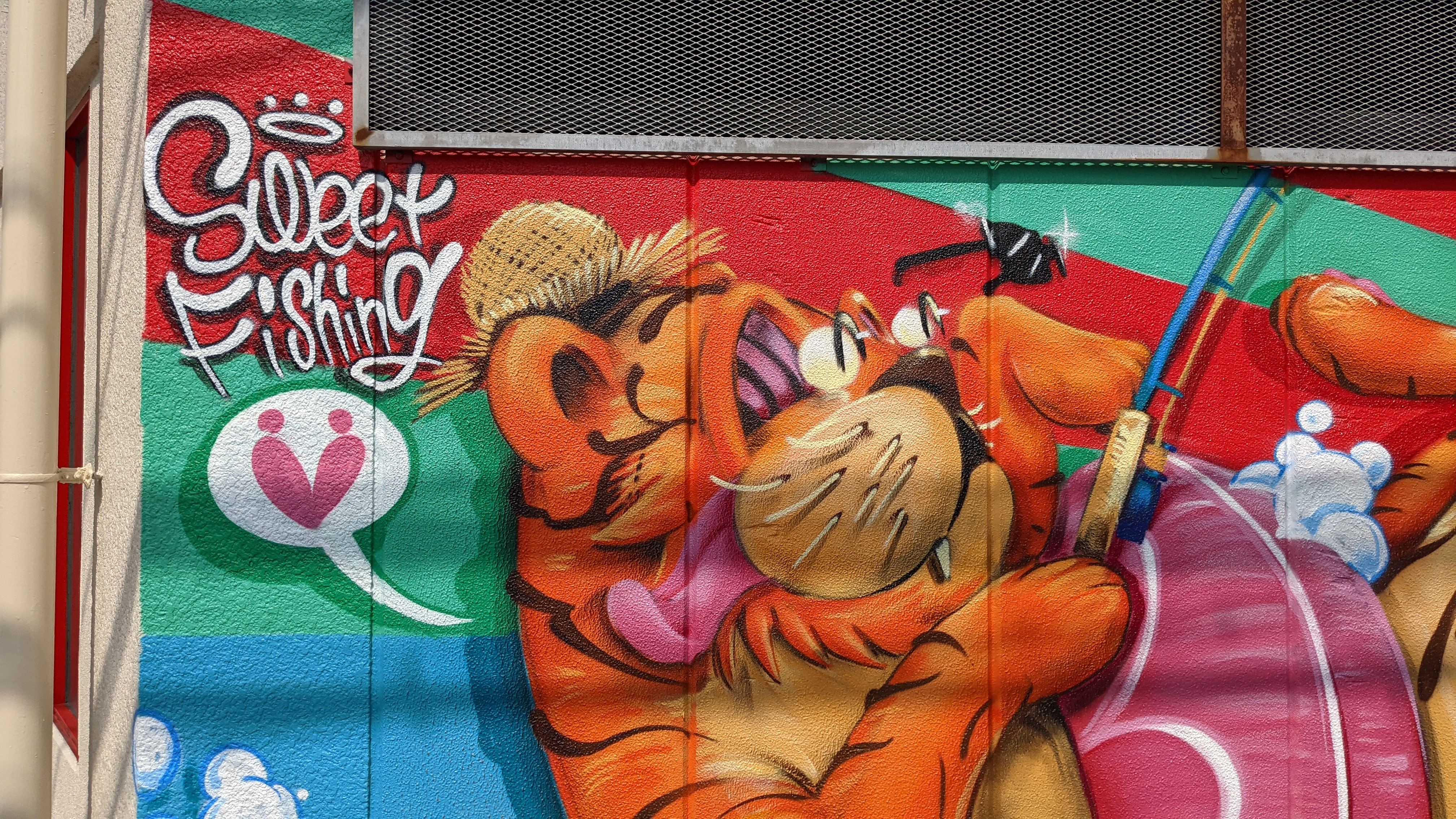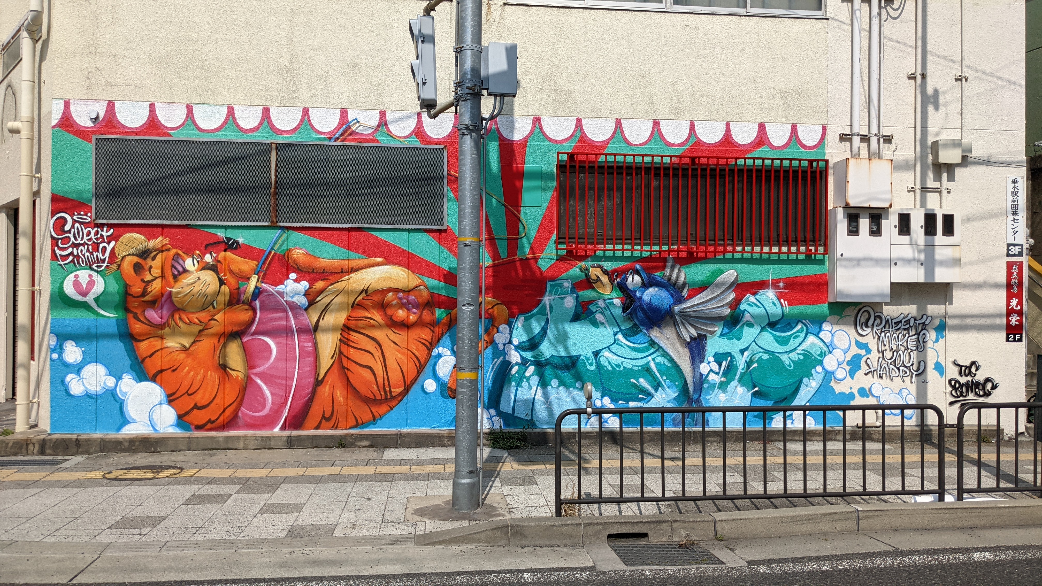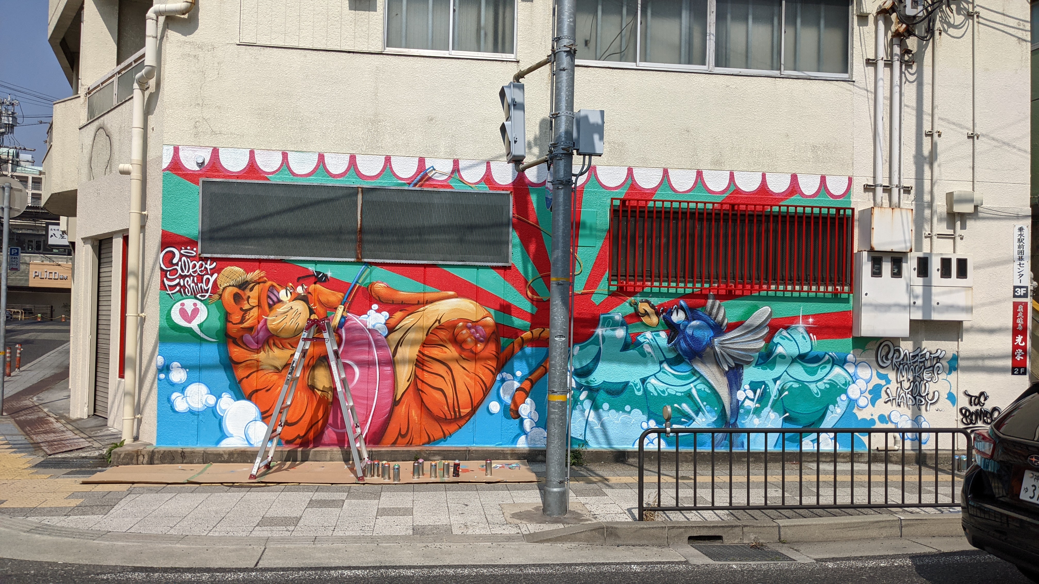 単なる飲食店の装飾に留まらず、行き交う人々の視線を「釣り上げる」ように引きつけ、一瞬で記憶に刻む。BOMBGWORLDが掲げる「アートを身近に」という想いを、国道というパブリックな舞台で表現したプロジェクトです。"
