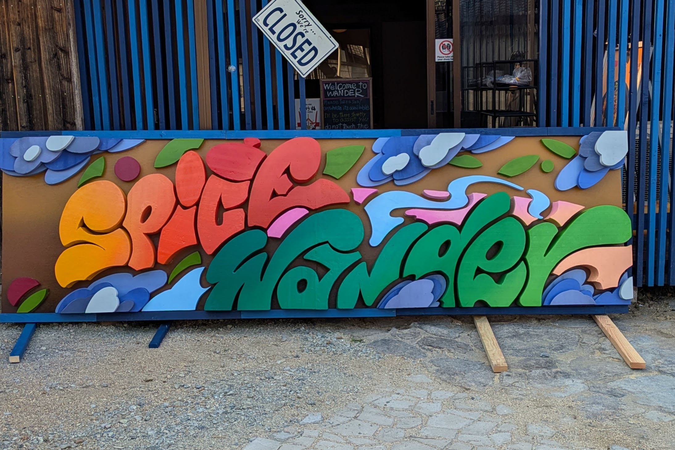 平面的な印刷物では表現できない、物質感(マテリアル)を伴う立体作品としての構成。飲食店への入り口を示すという機能を持ちながら、風景の中に違和感をつくり、かつ強い存在感を持って溶け込む造形を目指しました。